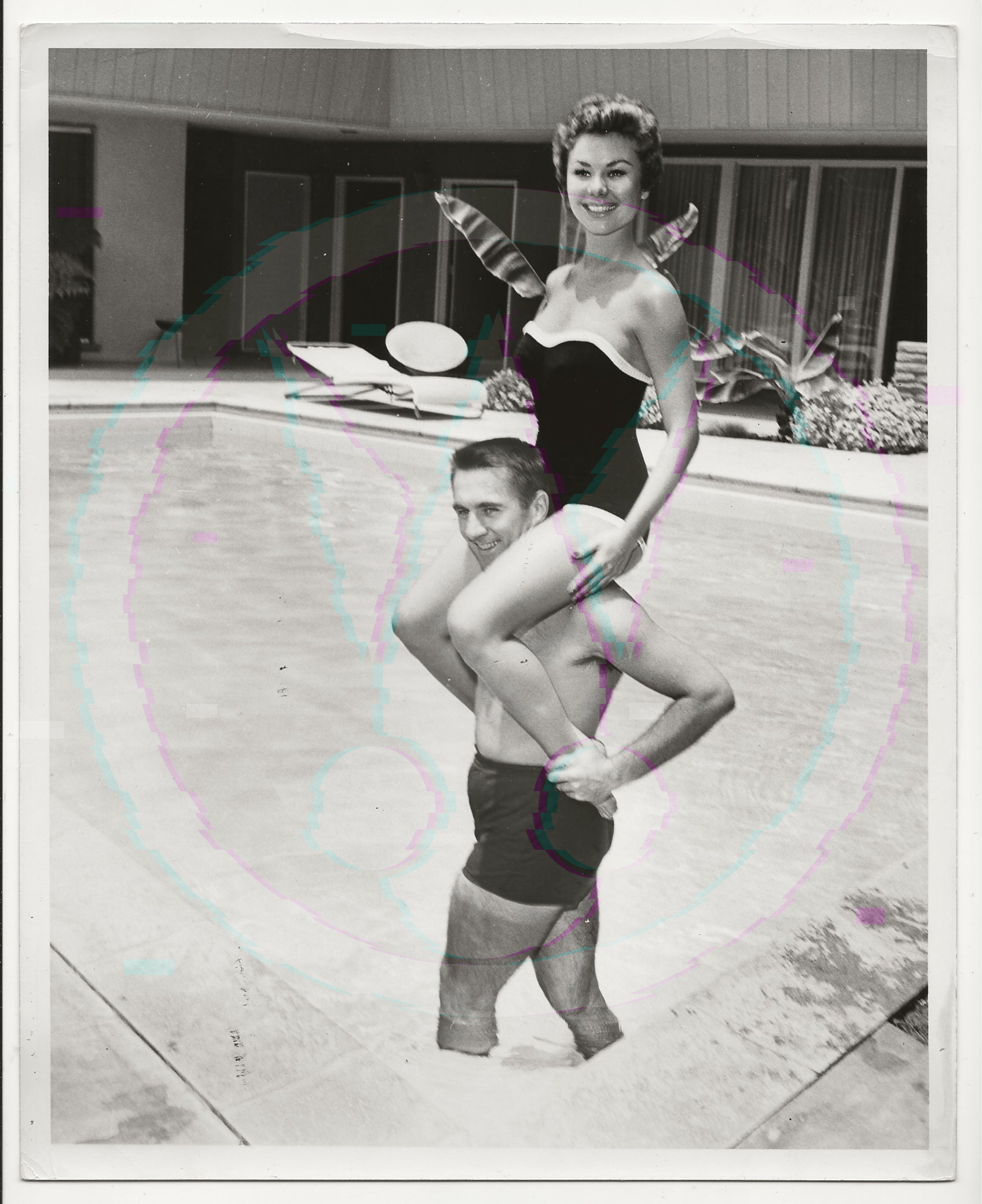 Behold Mitzi, perched precariously and perfectly on the shoulders of her husband, Jack Bean. Draped in a dark, strapless one-piece with a provocatively crisp white trim, she offers a smile that is as radiant as the mid-day sun. See the way the shimmering water clings to Jack’s chest? The way Mitzi’s bare, sinuous legs frame his silhouette as they engage in a private game in their secret garden? This isn't just a photograph; it’s a direct transmission of mid-century desire, captured by the voyeuristic lens of the elite Art Weissman.